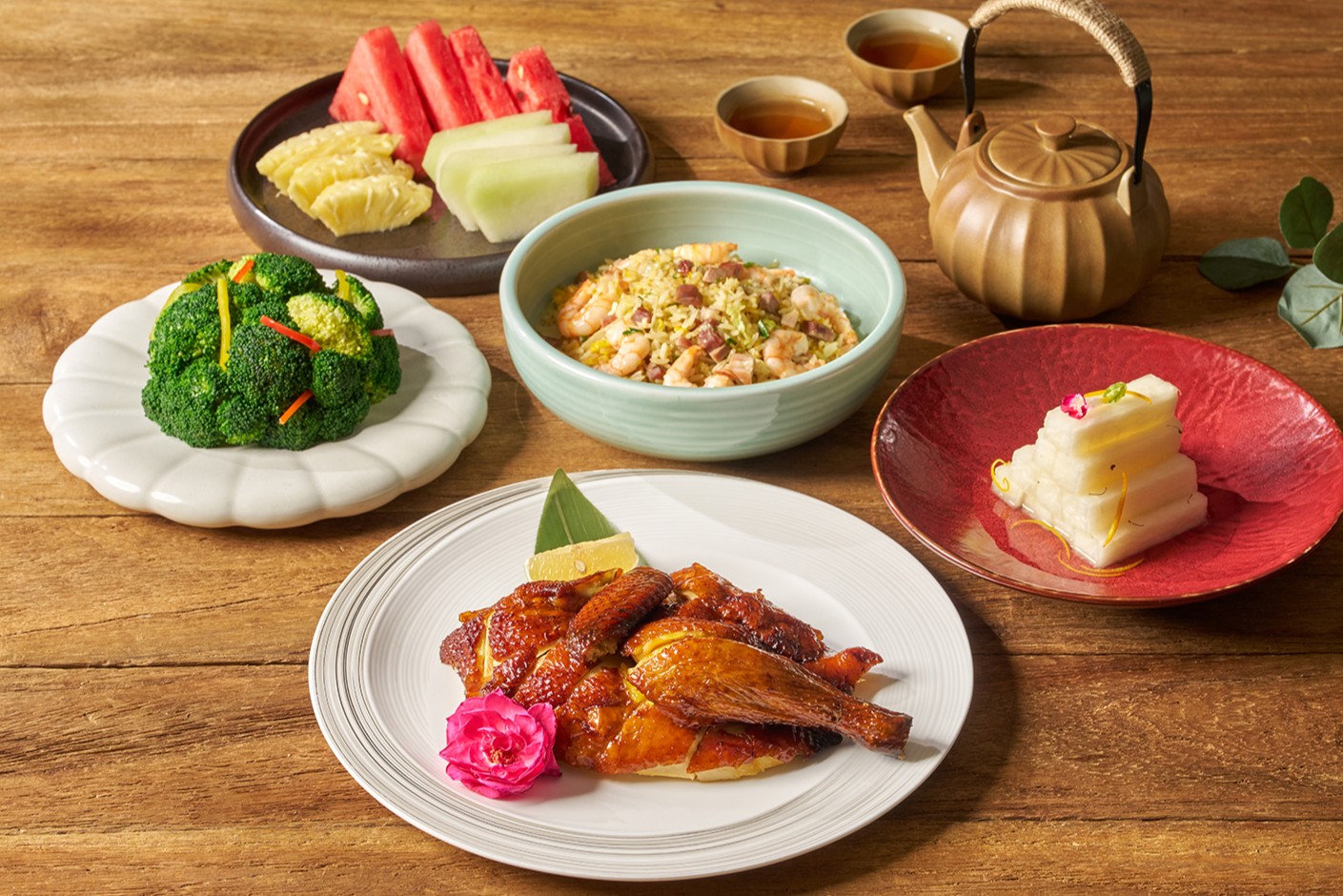 餐點包含:蒜香脆皮雞(半隻) / 桂花釀白玉 / 揚州香蔥炒飯 / 清炒季節時蔬 / 四季鮮水果