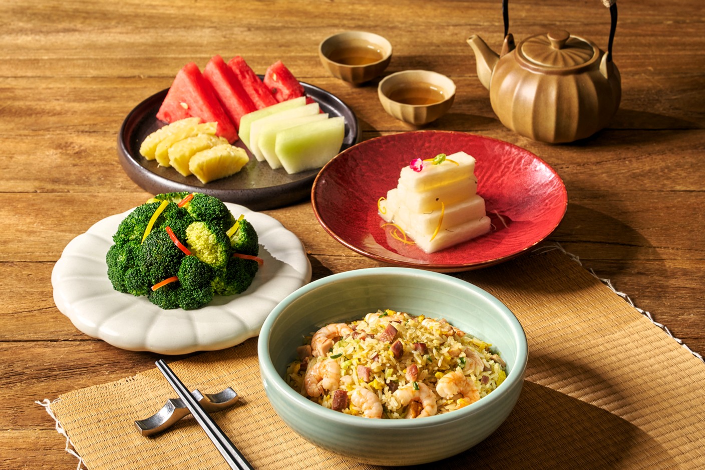 餐點包含:黃金老火煲湯(中鍋) / 桂花釀白玉 / 揚州香蔥炒飯 / 清炒季節時蔬 / 四季鮮水果
