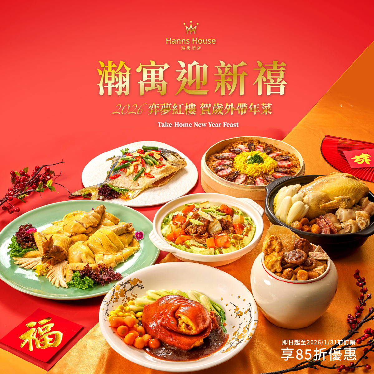 迎接 2026 年,「瀚寓迎新禧」外帶年菜正式推出。全系列餐點 780 元起,從迎春三喜開運盤、經典功夫菜到海陸佳餚一次備妥。其中最受青睞的 罈香魚翅佛跳牆,原價 3,280 元、早鳥 2,788 元,以澎湃用料呈現圍爐好滋味。不想苦惱組合的旅客,也可選擇主廚精選套組,早鳥優惠 8,888 元。凡於2026/01/31 前完成訂購,即可享限時早鳥折扣,輕鬆帶回一桌滿滿團圓年味。