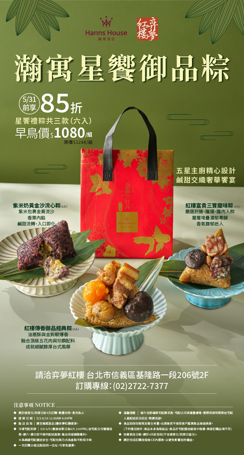 迎接端午佳節,瀚寓酒店館內餐廳弈夢紅樓推出「星饗御品粽」禮盒,由五星主廚匠心打造三款經典風味。內容包含「紅樓傳香御品經典粽」、「紅樓富貴三寶臘味粽」與「紫米奶黃金沙流心粽」,嚴選食材、層層堆疊,鹹香濃郁與甜潤滑順兼具,展現節慶款待的細膩質感。即日起至5月31日前完成預購並付款,即享早鳥85折優惠,六入禮盒早鳥價只要1,080元。無論企業贈禮或親友相聚,皆為兼具品味與心意的端午佳選,將節慶祝福細緻傳遞。